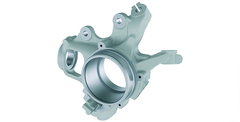 轉(zhuǎn)向節(jié)包納輪轂或驅(qū)動軸,連接到車輛的懸掛系統(tǒng)上。轉(zhuǎn)向節(jié)由球墨鑄鐵制成,對前懸架的安全性至關重要,因此必須具有優(yōu)良的表面粗糙度、精確的半徑和完美的平面度。加工涉及多種定制刀具,如三面刃銑刀、鉆頭和鉸刀。